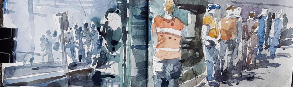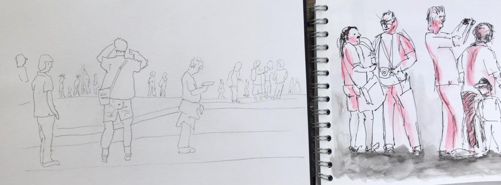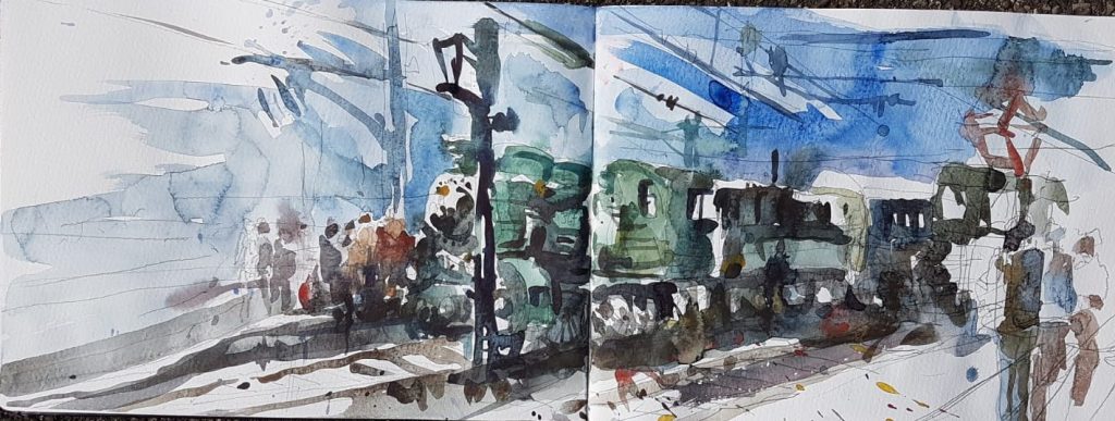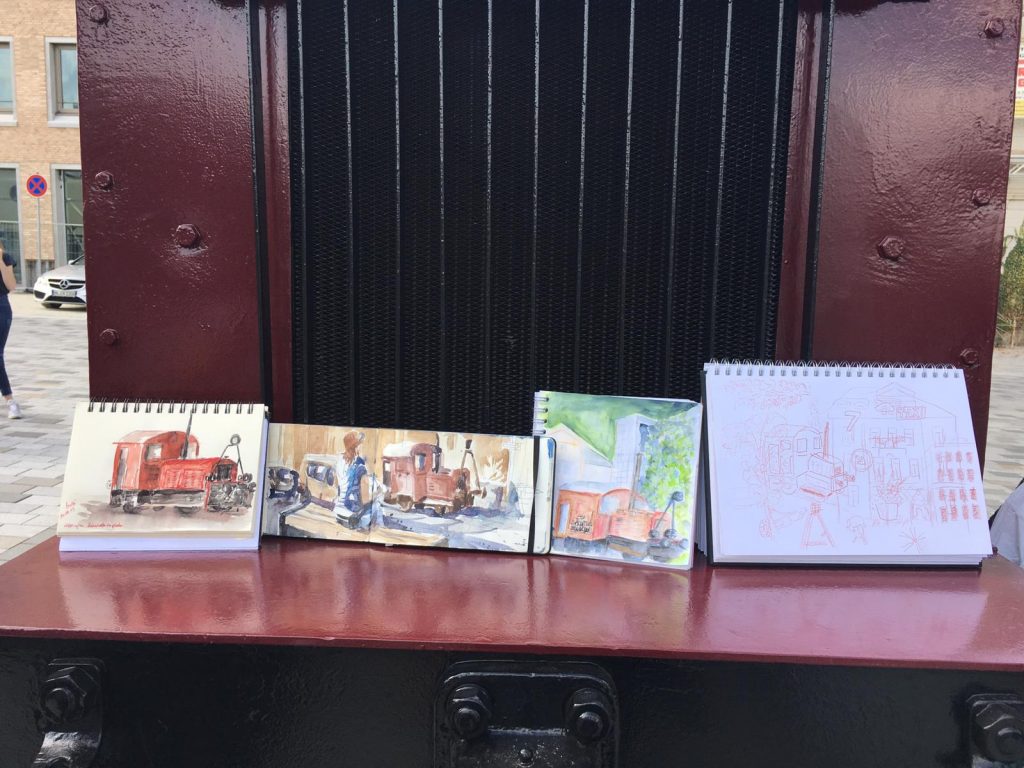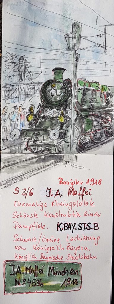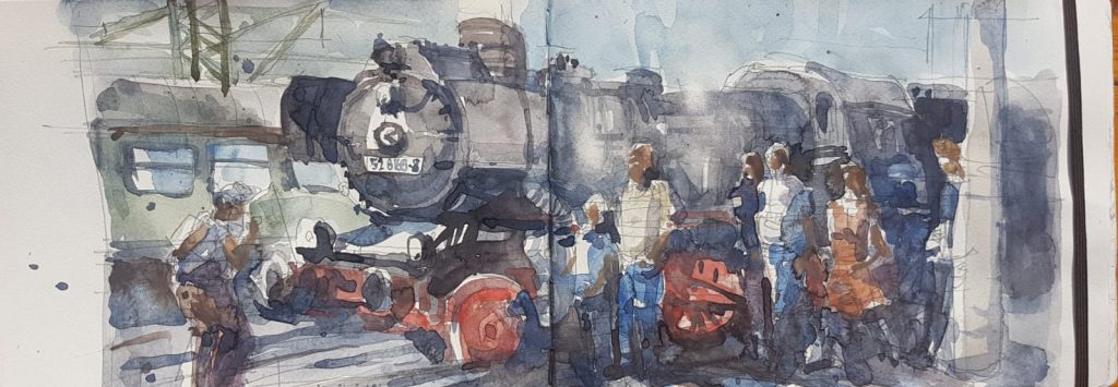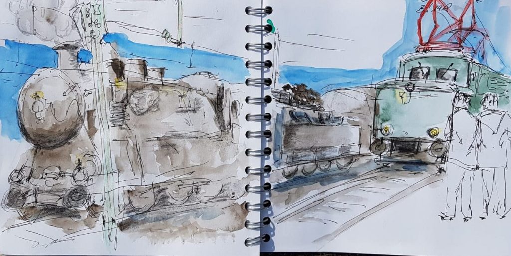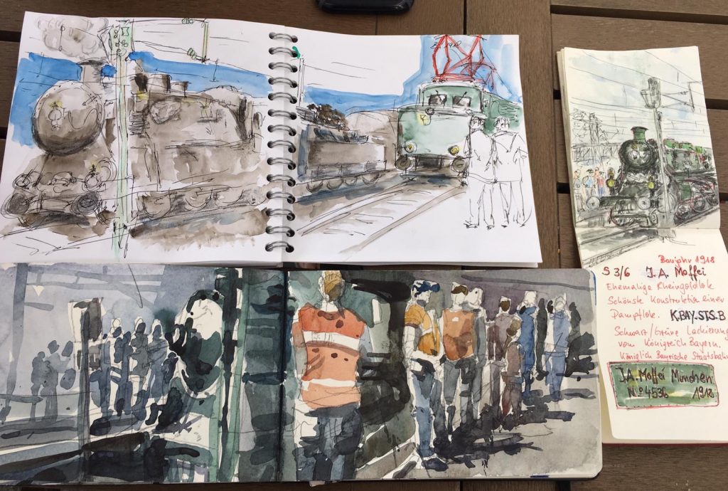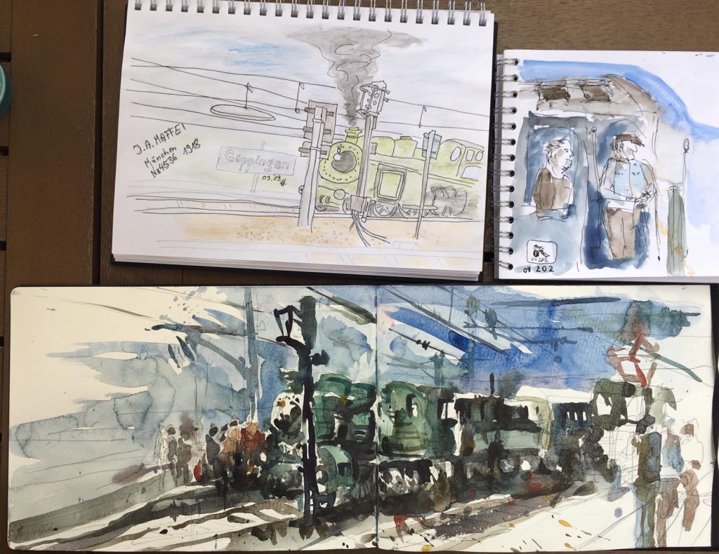 Am Samstag den 14. September konnten im Rahmen der Märklintage am Bahnhof Göppingen verschiedene Diesel-, E- und und Dampflokomotiven bewundert werden. Toll dass Susanne unseren ursprünglichen Treffpunkt dorthin verlegt hatte. Die Gleise waren voll Besuchern von Nah und Fern, trotzdem sind ein paar schöne Zeichnungen entstanden.